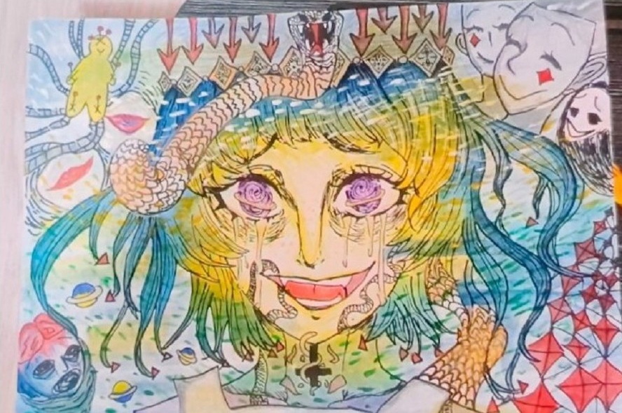 坐定閒聊,今年升上高一的小婕,談吐穩定自然,但我們發現她的腳尖卻一直輕輕墊著。她笑著說,「我其實很緊張啦!」真是坦率而可愛。已經考上基隆二信的她,從小喜歡畫畫,對藝術很熱情。她靦腆地打開手機,讓我們看了幾幅她的畫,帶有濃濃的動漫風格,特別是人物的眼睛筆觸細膩,好像每幅作品裡都有一段小劇場。